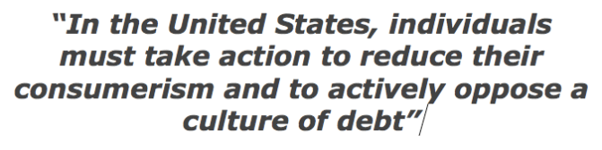 In the United States, individuals must take action to reduce their consumerism and to actively oppose a culture of debt. How? Abandon the traditions of the American Dream that do not serve this generation. Join an Occupy Wall Street movement. Pay off your credit card and live only within your means. Shop for fewer articles of better quality. Repair your broken clothes and recycle them into quilts or pillows. Take a challenge (ahem…) and commit to changing one spending/shopping habit.