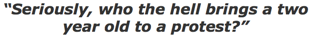 I question the fairness of bringing children into ANY political or social cause. They’re too young to be able to make an informed decision about supporting or repudiating a cause (need more support for this idea? Check out the kids of the Westboro Baptist Church), and they can easily get too riled up. I saw that in the march on Saturday, in the distressed face of a nine year old who had to be pulled aside by his parents to calm down after a little too much time on the People’s Mic.