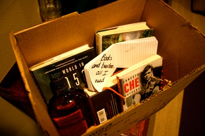 Books, Bourbon, and a box. All I need to have a happy day in the Colorado winter. I’ve got a great spread of authors to keep me company (Guevarra and Allende, to start with) and the spicy spirit to keep me warm. Bring it on, weather! More beautiful snow, please!
