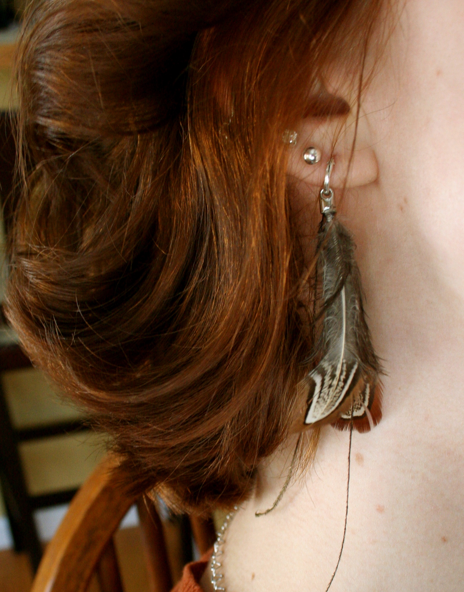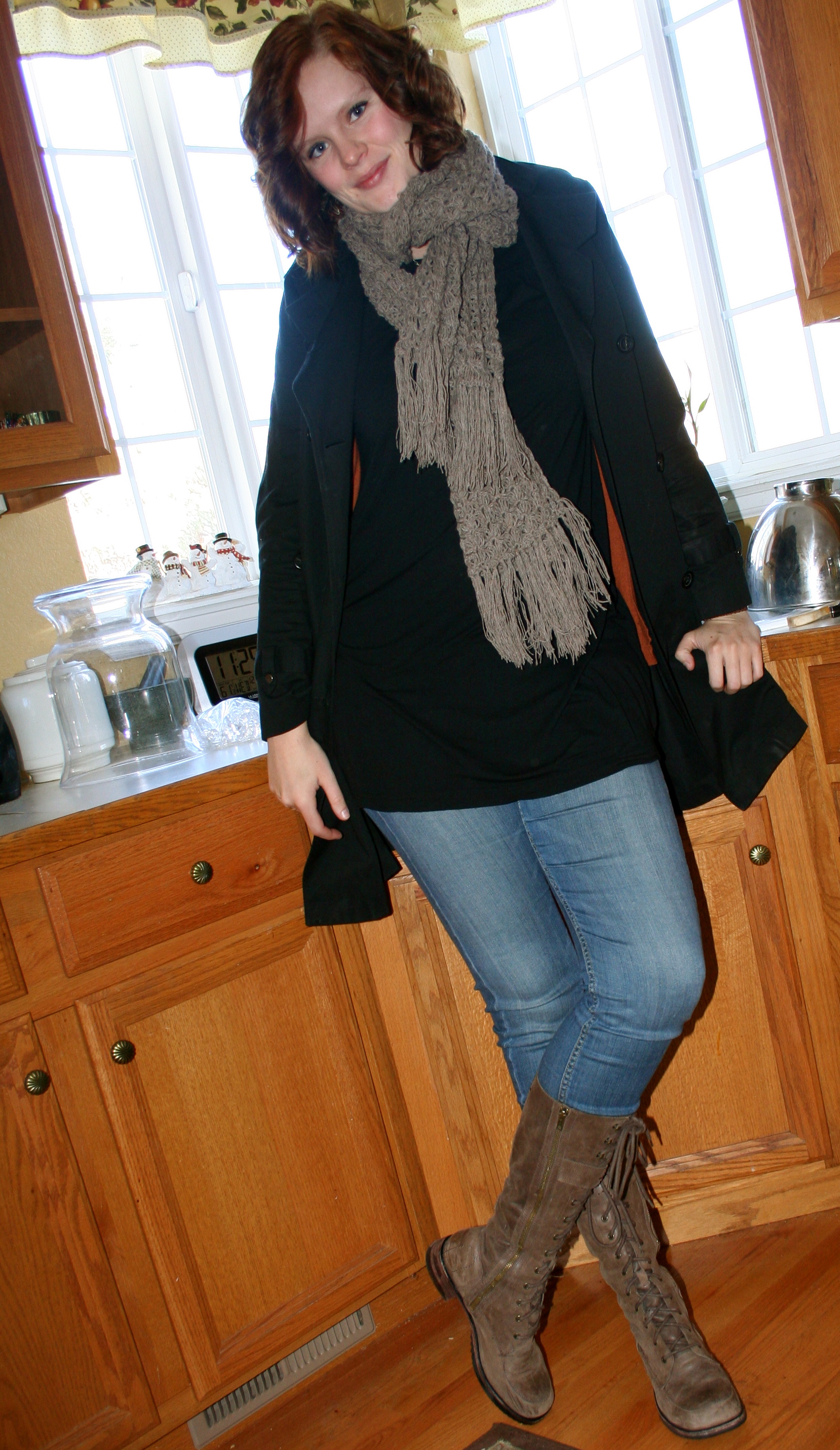 Jacket: Sisley (Italy in 2009) Scarf: Handmade as a gift from Puerto Natales, Chile Orange shawl-thinger: Consignment (Buffalo Exchange Boulder) Black Dress: Consignment (Common Threads Boulder) Jeans: H&M (GIFT) Ass-Kicking Boots: Consignment (Common Threads Boulder) Earrings with Feathers: Homemade
