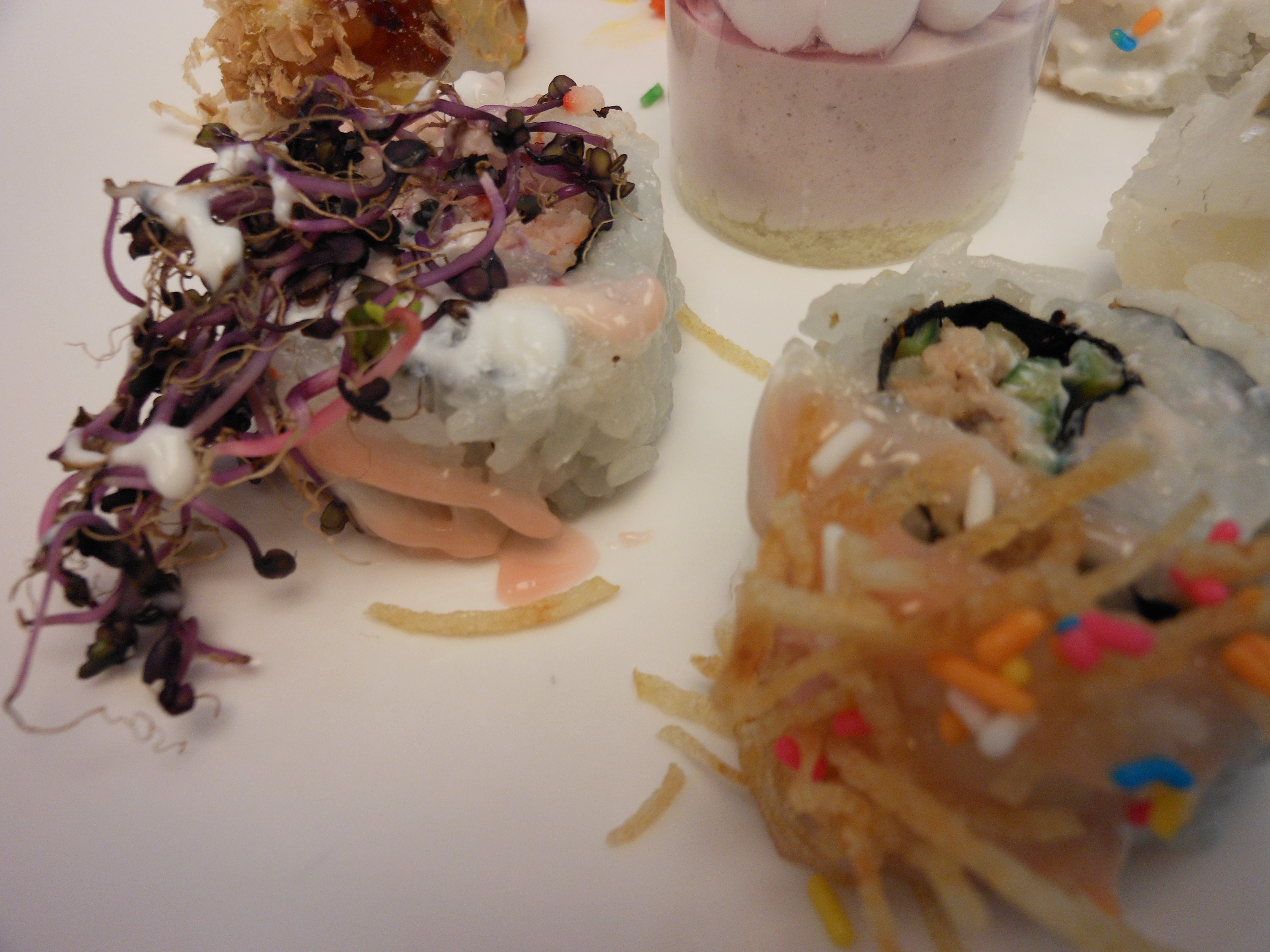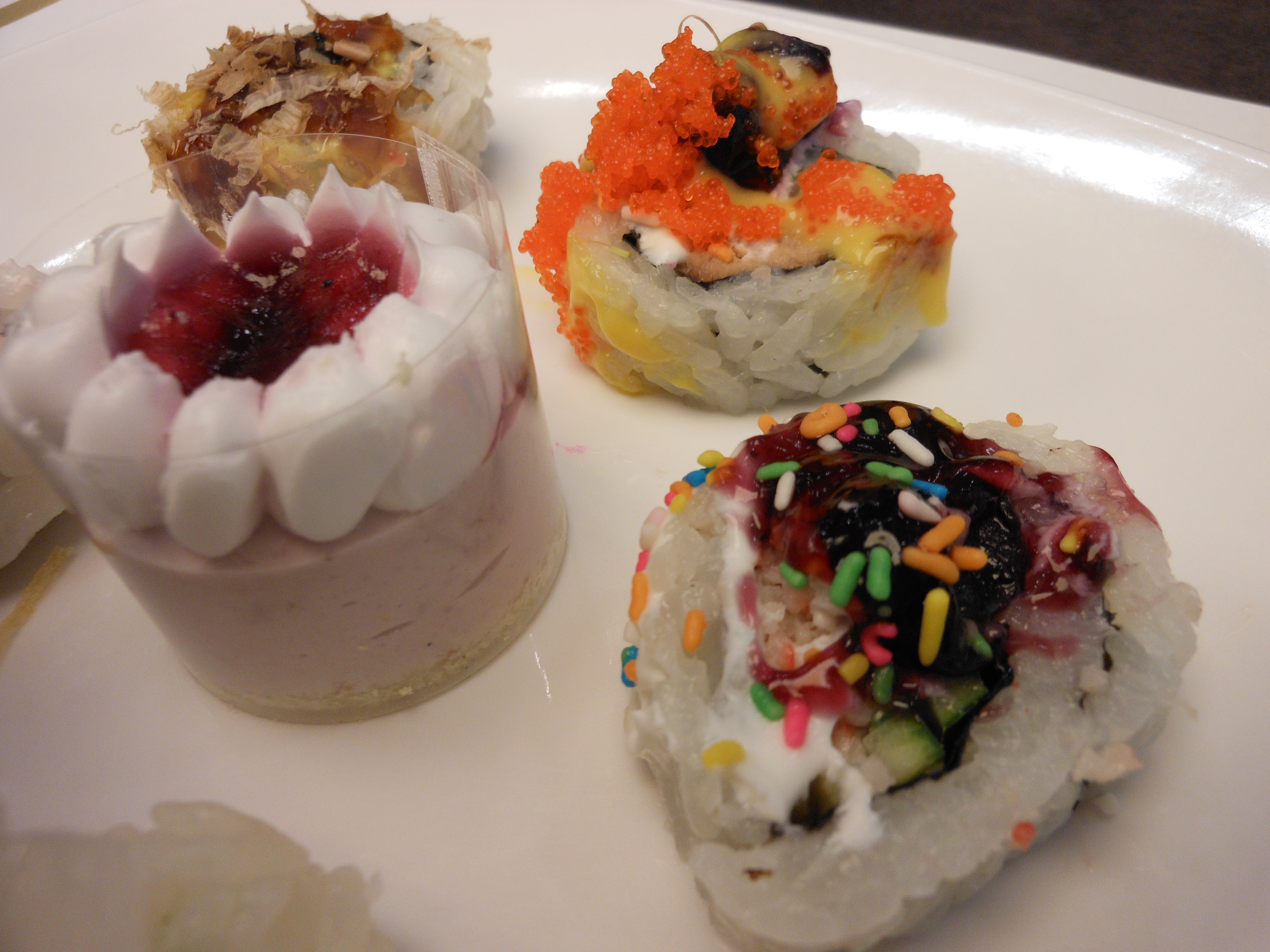 What in the name of blueberry jelly is this? Sushi with sprinkles? It must be special dessert rolls, without the typical fish required of sushi rolls. I pop one with bright colors on it into my mouth.