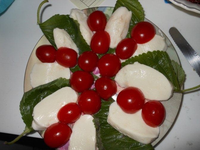 Korean-style Caprese Salad. made with tomatoes, mozzarella, and sesame leaves. I miss eating fresh, good food every day instead of a couple times per week.