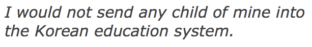 I can’t speak to the global implications of pitting students from hugely different backgrounds against one another solely through a multiple-choice test administered to 15-year-olds every year (and since I am a teacher of students of the same age, I can honestly say that they probably take it way less seriously than the OCED does). I can’t talk about the public education system in South Korea, as I’ve never set foot in a public school. I can’t truly understand the motivations of parents, seeing as I can’t even call them for a chat if their child acts up in class due to my personal massive language barrier. Yet I’m still against adopting South Korea’s education culture.