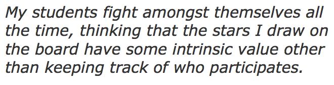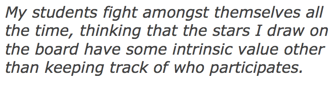 All this pales in comparison to the way that the culture of rote-memorization and overloading students from the time they enter the world with study and pressure destroys the true meaning of education. The real reason that I would never want my own child to be raised in the system of South Korea is that I want them to have a different education. I might argue a “real education.” Social, cultural, philosophical, and imaginative development all bow to the great gods of test scores and class rankings here. My students fight amongst themselves all the time, thinking that the stars I draw on the board have some intrinsic value other than keeping track of who participates.