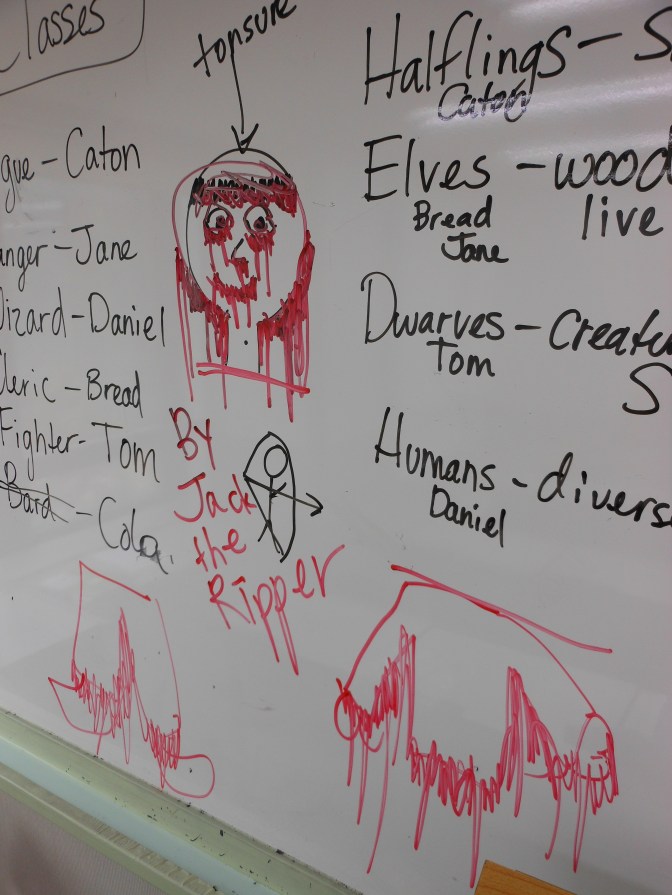 I walk away from my classroom for five minutes and I come back to *this*. There is an explanation (currently in Seoul there is a large-scale musical complete with glittery costumes called Jack the Ripper), but still.