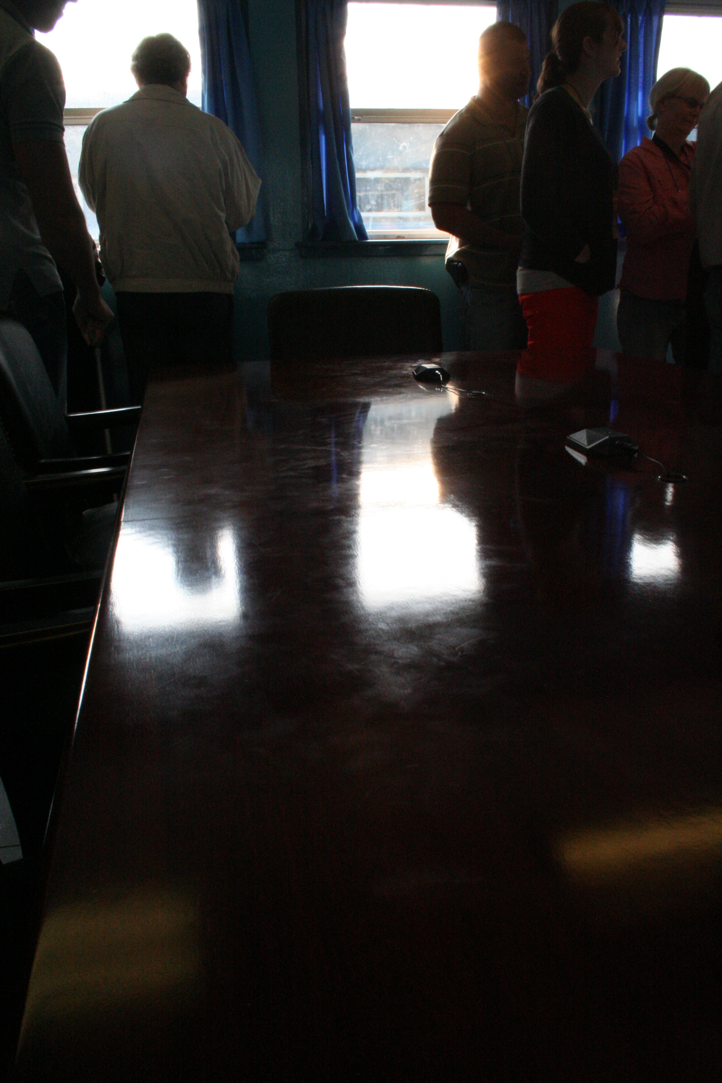 Shutters click. Voices mumble in soft tones. There are footprints on the tables, clearly not cleaned off in a while.