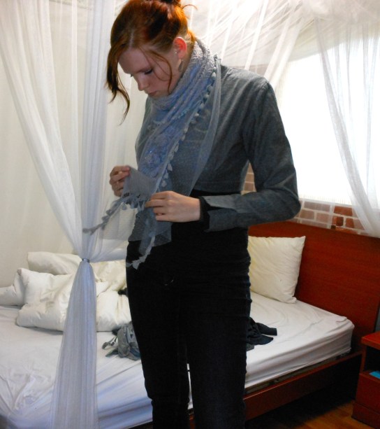 For my birthday, I got a beautiful fair-trade cotton jacket from Mata Traders. It fits just right and it’s a perfect weight for the late autumn days. I decided it was too va-va-voom without a scarf, so I added the sparkle scarf I bought for myself one year ago when I lived in Annecy.