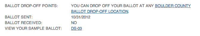 EDIT: This post was made on 7th November 2012. My ballot eventually arrived, more than THREE MONTHS AFTER the election in January 2013. To say I was disappointed with the services of the Boulder County Clerk’s office is an understatement; I laughed so loudly and bitterly that my Korean coworkers thought I’d finally snapped.