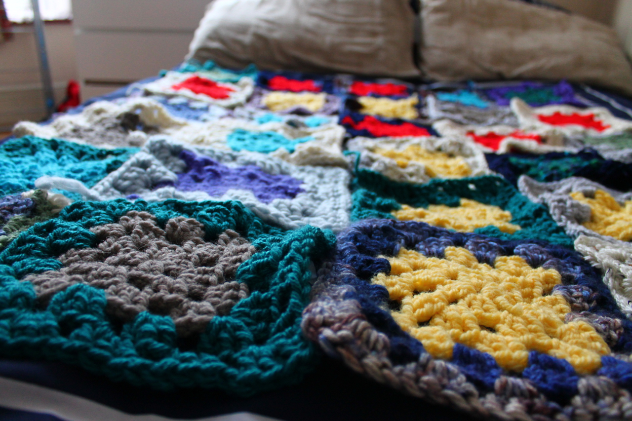 Halfway finished. Only 30 more squares to go until it’s time to join them! This is my international blanket, which I began in South Korea in January 2012 and have carried with me around the world. Wish me luck!