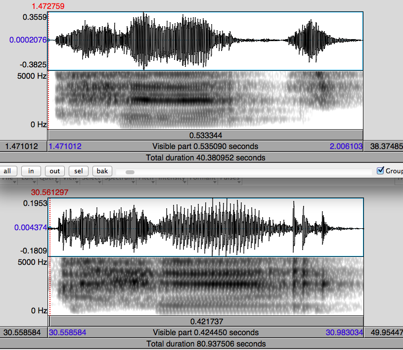 I can hear the creaky voice, and probably see it a bit in the graphics of my voice. Note the big fat striations on the waveforms here for the word ‘or’ in creaky voicing. You can hear ‘creaky voice’ a lot in GenAm accents, especially when people are tired. President Obama has it show up all the time, actually.