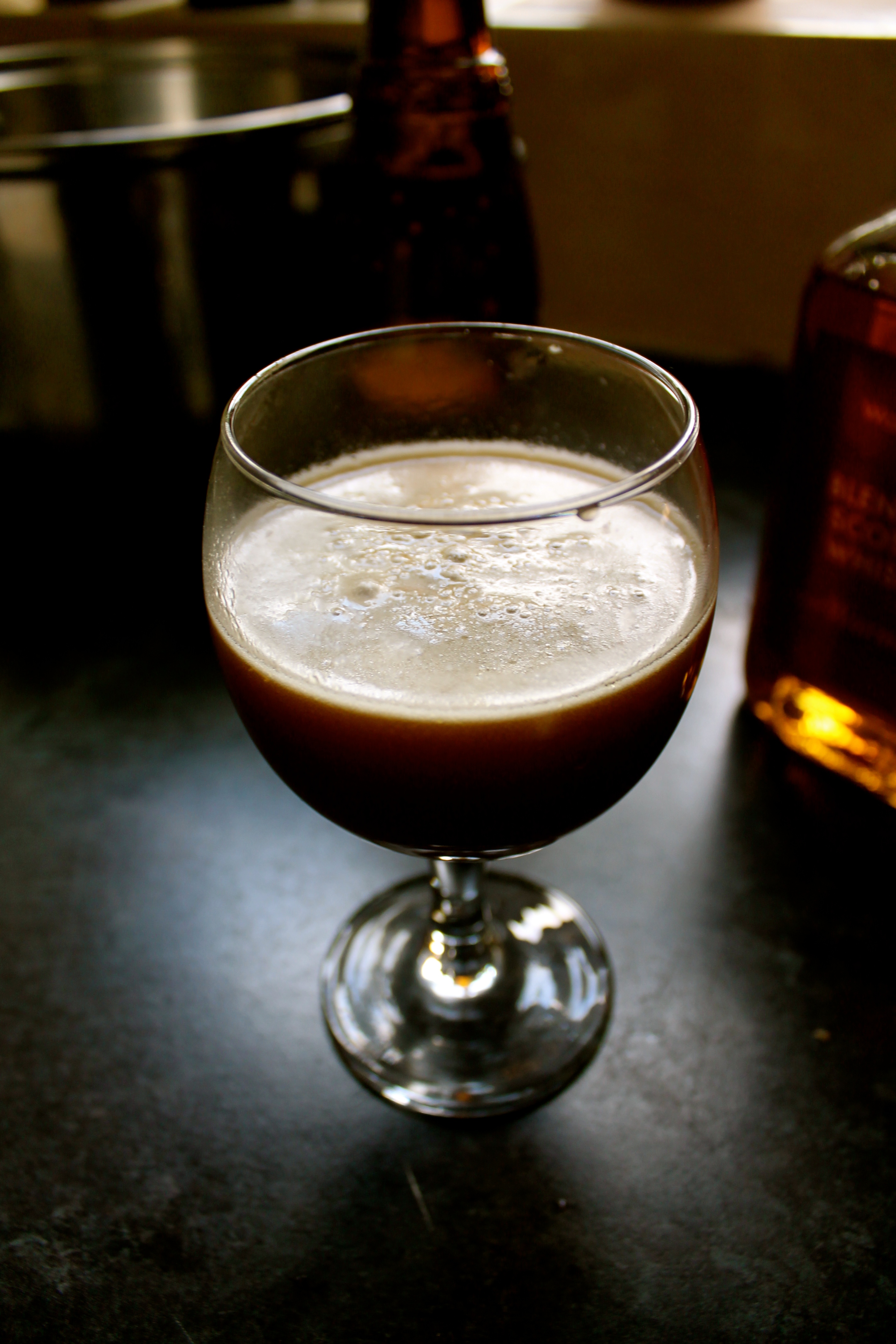 EDIT: Instead of being sensible and making a classic, I decided to innovate for my very first venture into the Cocktail School. I need a name for this heady combination of scotch whiskey, trappist dubbel, cold-brewed coffee, and butter. Yes. Butter.