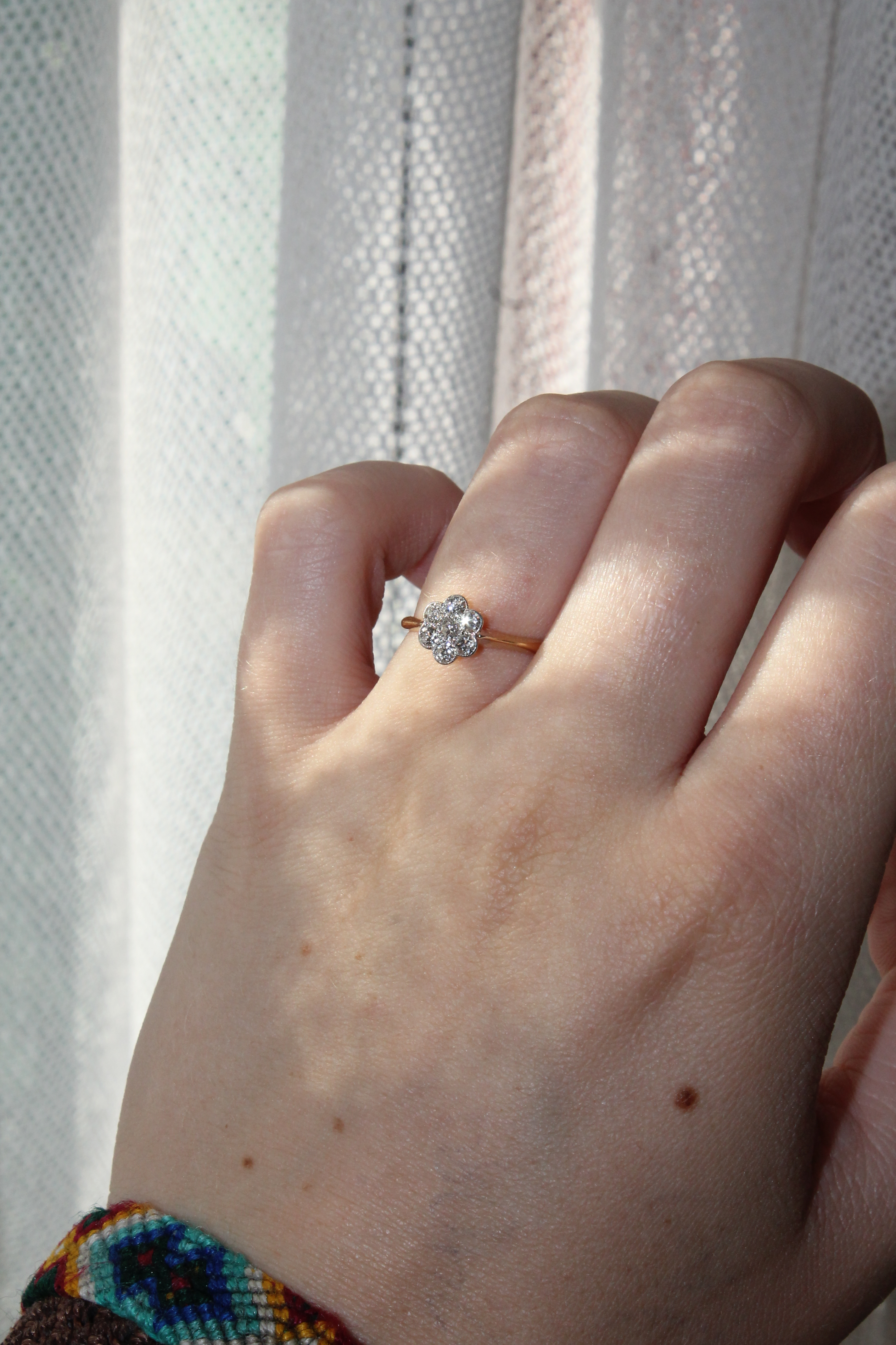 My ring is Art Deco, with older cuts on the seven small diamonds. It was made in the 1920s or 1930s, which is a time period with which I connect greatly. It’s unique, and it reflects the fact that my fiance made me a ring from a flower for his proposal (which he eventually scrapped, and went for a single aspen leaf instead). We chose the ring together in a family-owned and operated antique shop, and paid less than our individual monthly rent. It’s a symbol of our commitment, but also of the pragmatism that characterises our relationship.