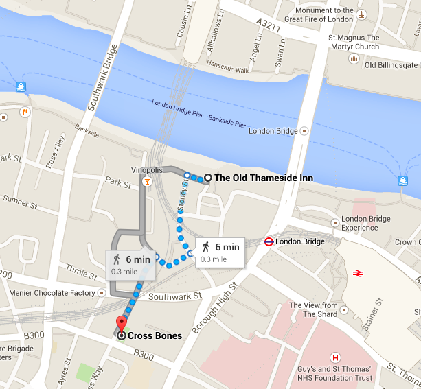 A redorange London Ribs boat buzzes by. I am at the Old Thameside Inn, in Southwark. One of the oldest and most storied bits of the Big Smoke. One of the most medieval-felling bits. My lonely status here in the pub as a woman would as recently as the 1940s marked me as one of the many thousands of prostitutes who lay in Cross Bones, less than half a mile from where I”m enjoying a pint on the Thames. Screen Shot 2014-09-02 at 15.23.46