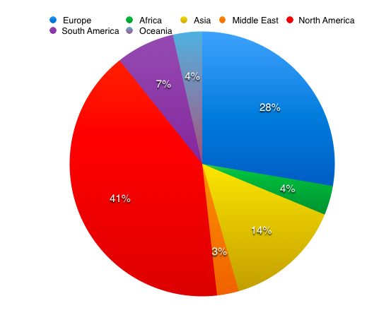 - North America: 31 total, 24 USA