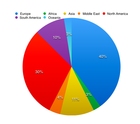 - Europe: 46 total, 32 USA