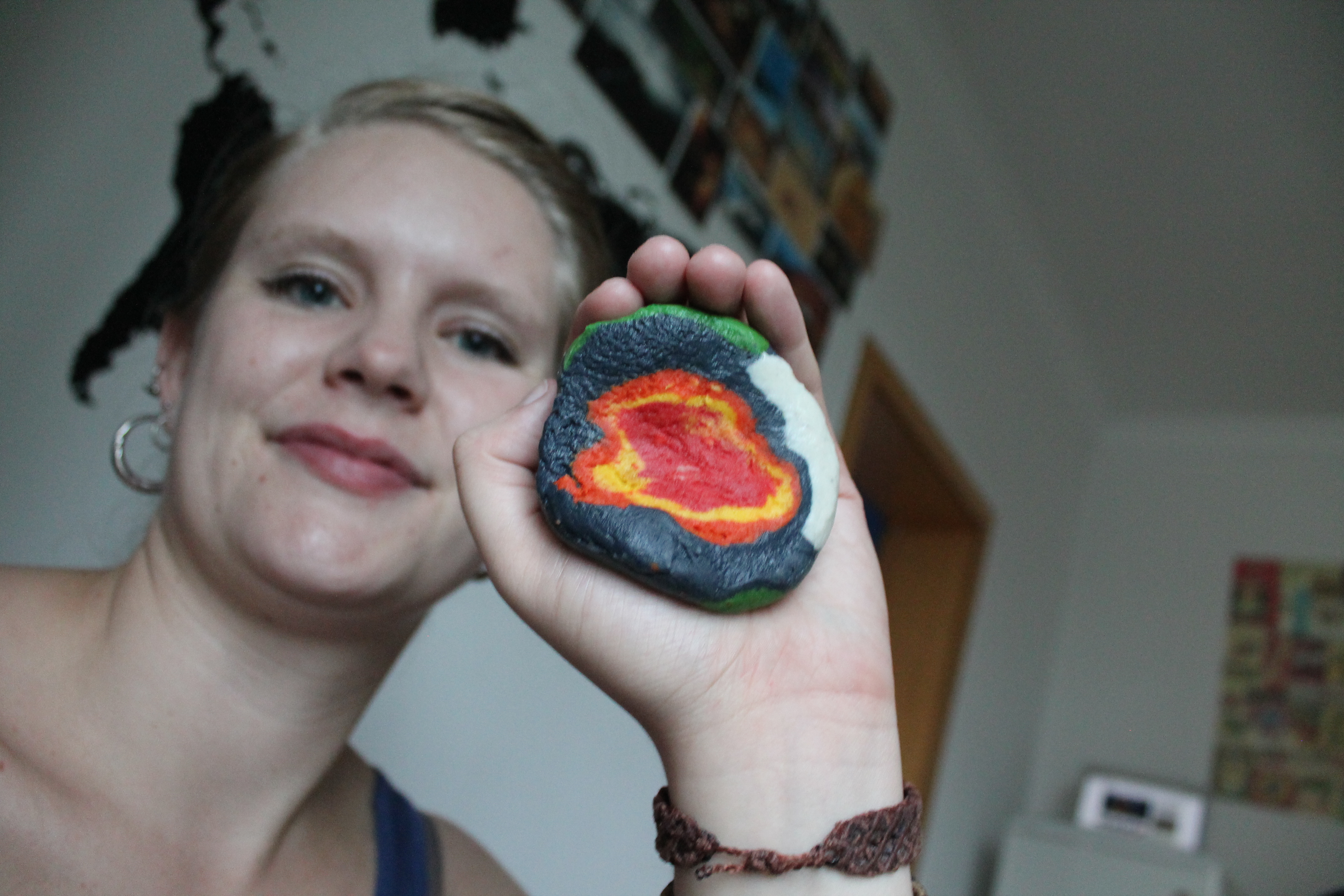 But I’m teaching science this summer. I have six teenagers, in a classroom that sometimes cooperates and sometimes doesn’t. I force them to read a shitload of scientific readings. I force them to recite the steps of the Scientific Method at the beginning of every class. I made a compass with a stolen magnet and two paperclips today, and showed them the ionosphere under attack from a solar storm. I made this Earth out of playdough that I semi-drunkenly threw together last night. We talked about magnetism, the Earth’s resources, and BattleBots.