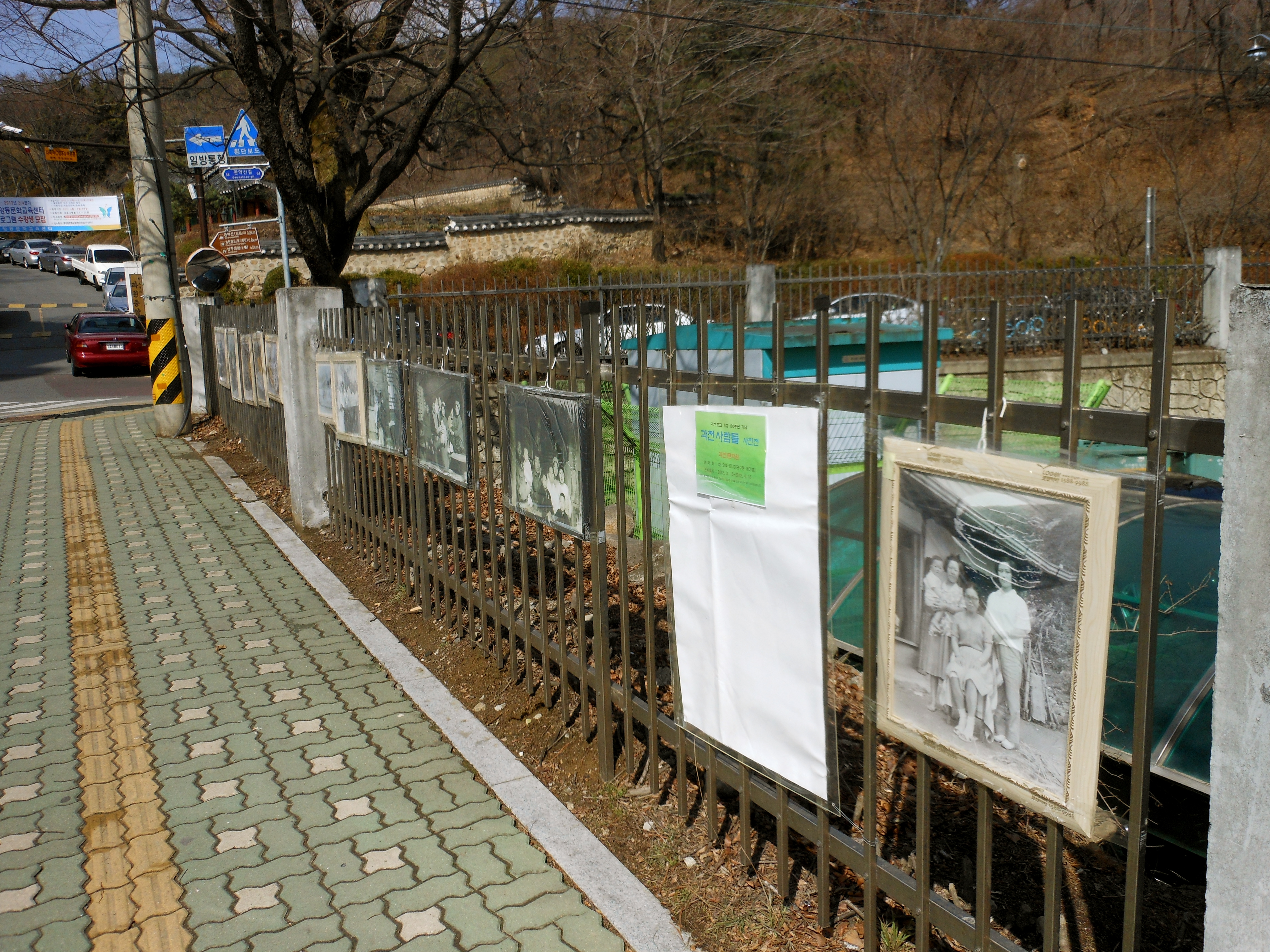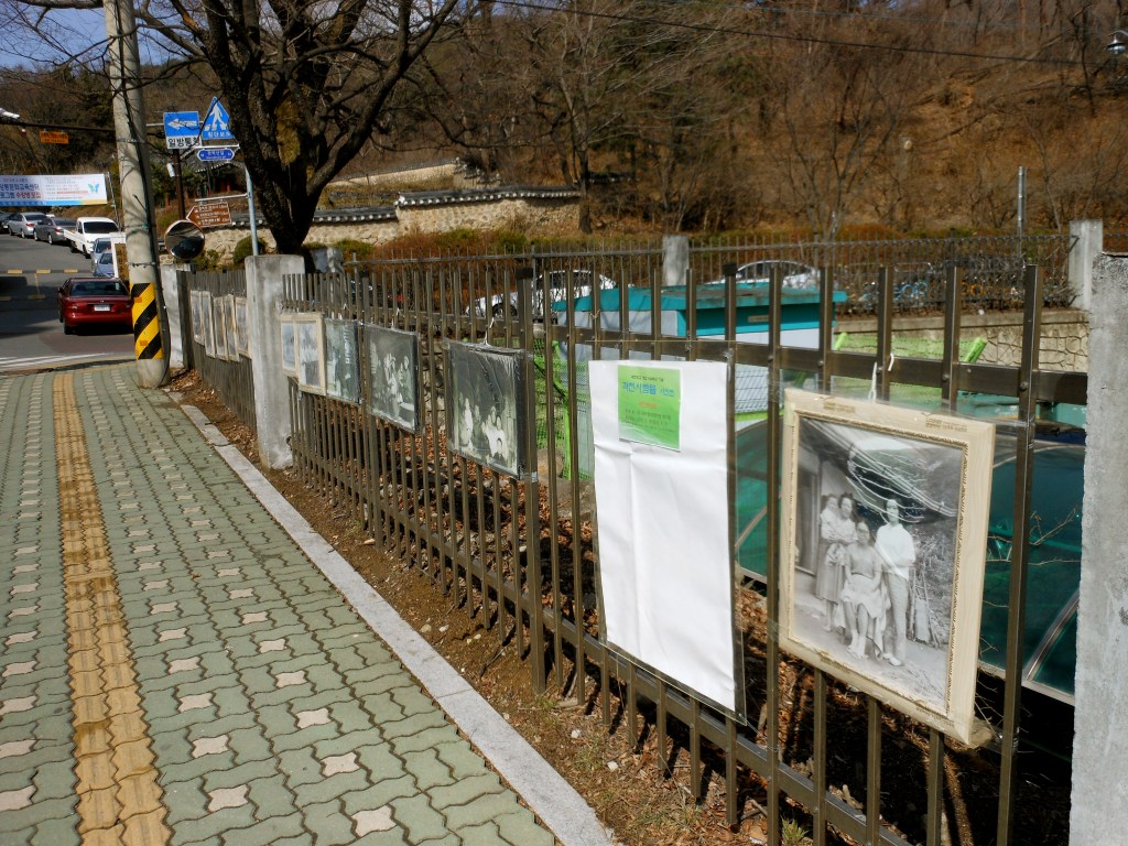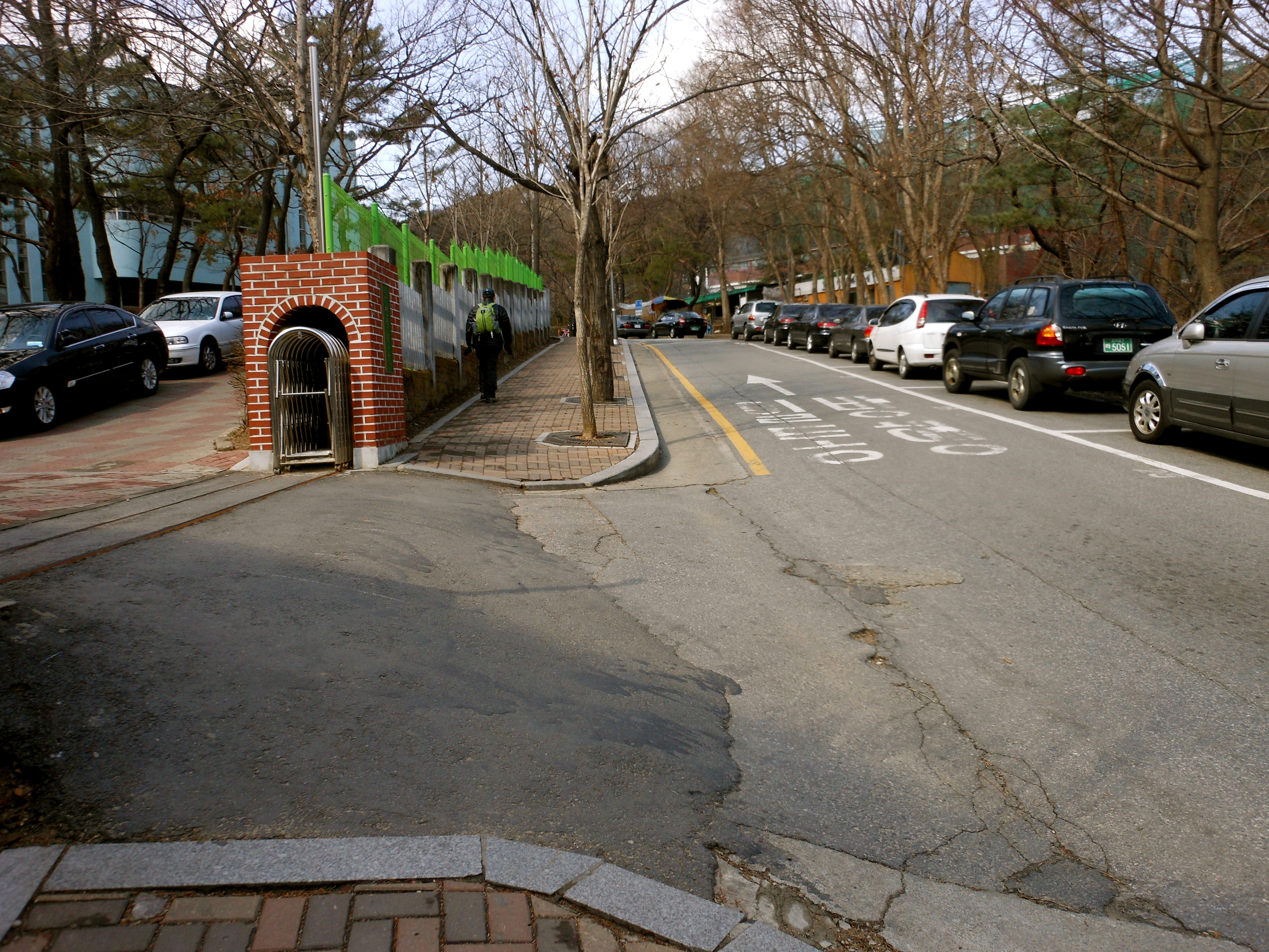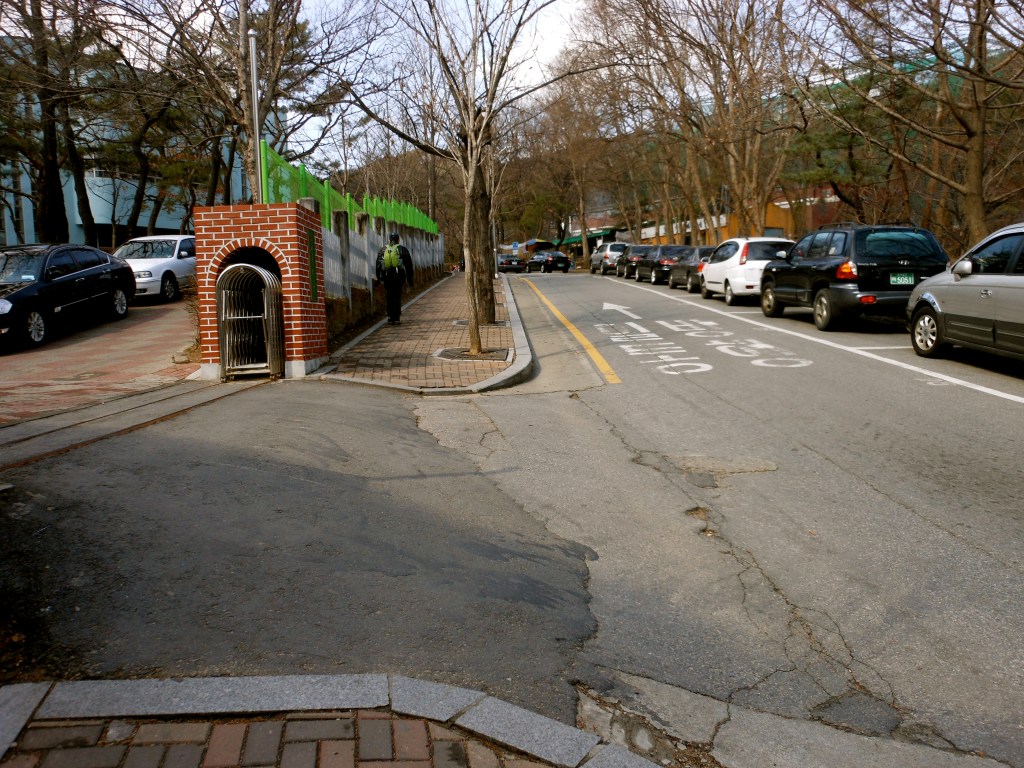 You can see another brown sign, a little bit smaller this time. Turn left and head up the street. You will cross a bridge over a stream and Gwae-Cheon Presbyterian Church (which is really more of a complex) on the left. The road wanders for about .5 Km through a residential area.