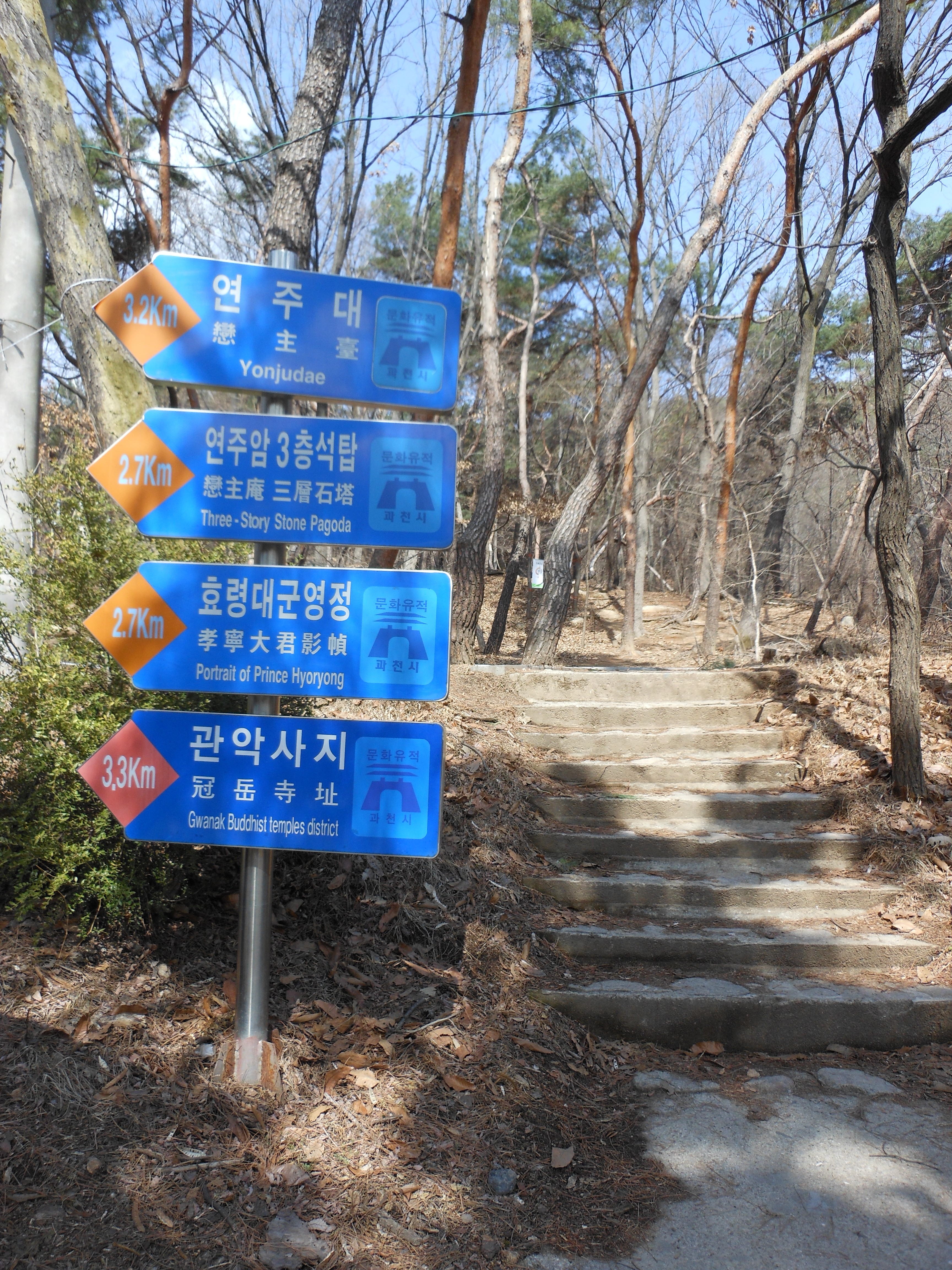 Turn right and follow the trail past the temple on the right and continue past the wood sculpture shop. You will pass several Makeolli/fruit vendors and eventually you’ll see a blue sign pointing to the way up the mountain, and you want to go toward Yonjudae. Enjoy your hike!
